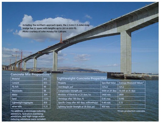 位于美国圣佛朗西斯科海湾的Benicia-Martinez大桥,长2.5公里,有22个最长跨度为201米的桥拱。大桥混凝土采用了轻骨料,并使用了高活性偏高岭土来提升大桥性能及耐久性。